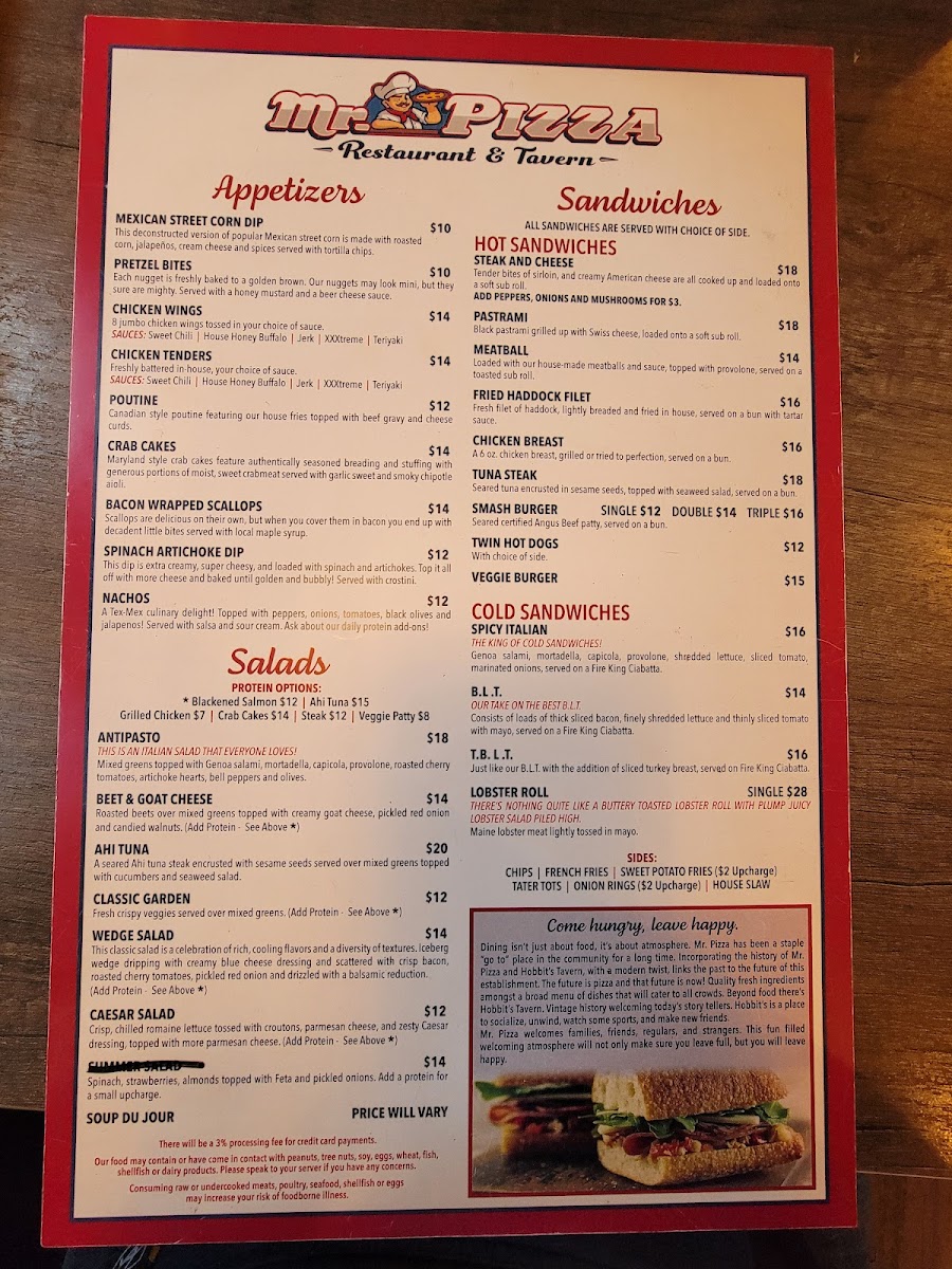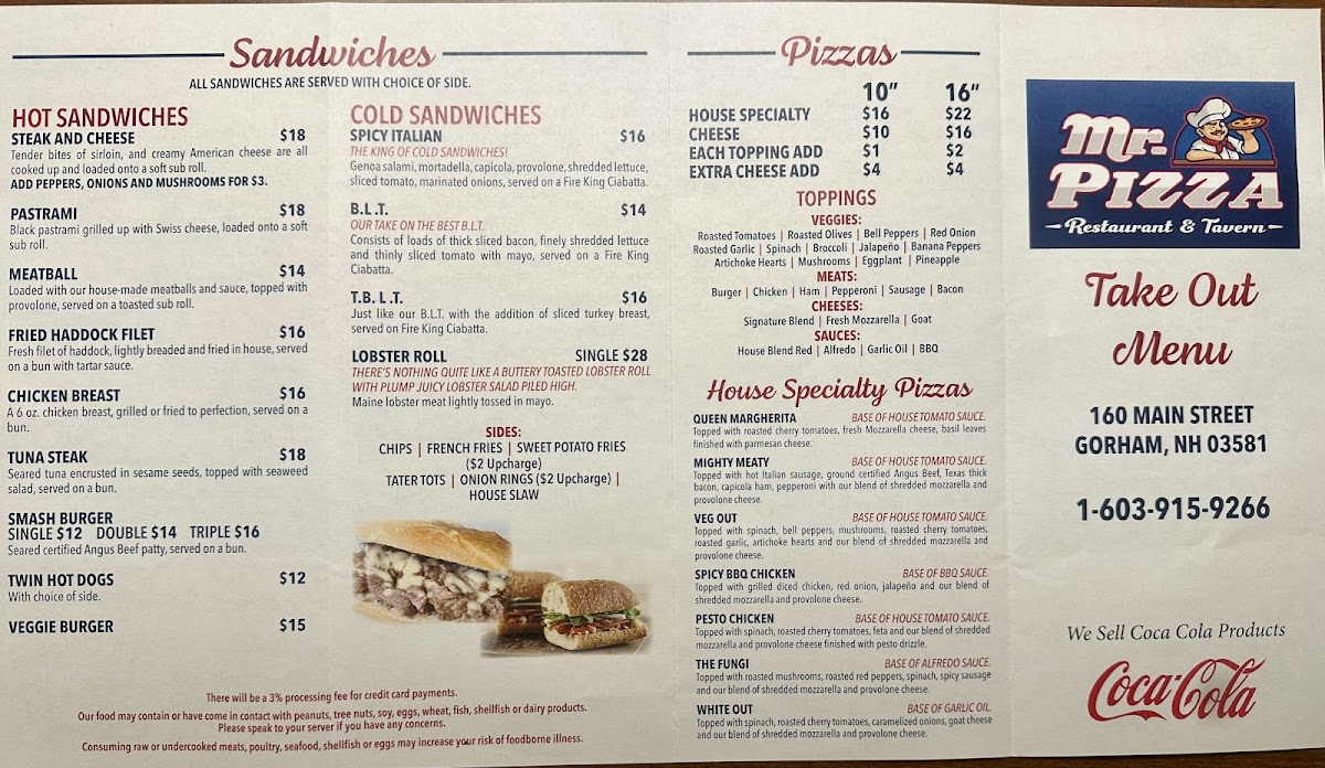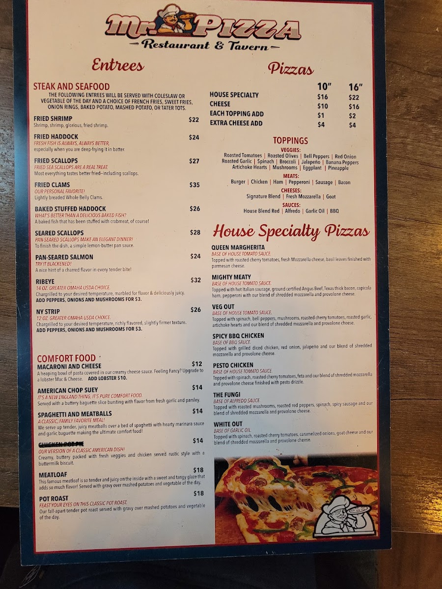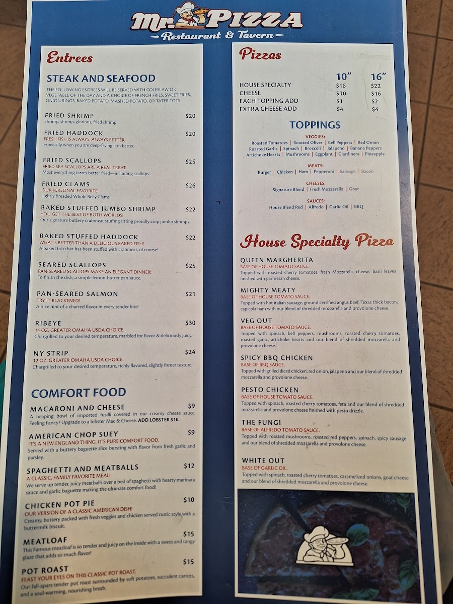 Welcome to Mr. Pizza Restaurant & Tavern, a delightful pizzeria nestled in the heart of Gorham, NH. This charming eatery offers a diverse menu that extends well beyond traditional pizza. From delectable entrées like Fried Haddock and Seared Scallops to their signature house specialty pizzas such as the Queen Margherita and Veg Out, there's something to tempt every palate.